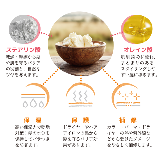 西アフリカ原産のシアの木の実の種子から採れる天然の植物性油脂「シアバター」は、高い保湿力と肌なじみの良さから、スキンケア、ヘアケア、リップケアなどに広く使われる万能バームです。ステアリン酸とオレイン酸のバランスが特徴で、とにかく高保湿力!